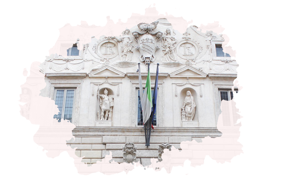 Die Stuckdekorationen an der Außenfassade sind übrigens von Giulio Mazzoni. Zu sehen sind acht römische Berühmtehiten: Trajan, Pompeius, Fabius Maximus, Romulus, Numa Pompilius, Marcellus, Caesar und Augustus.