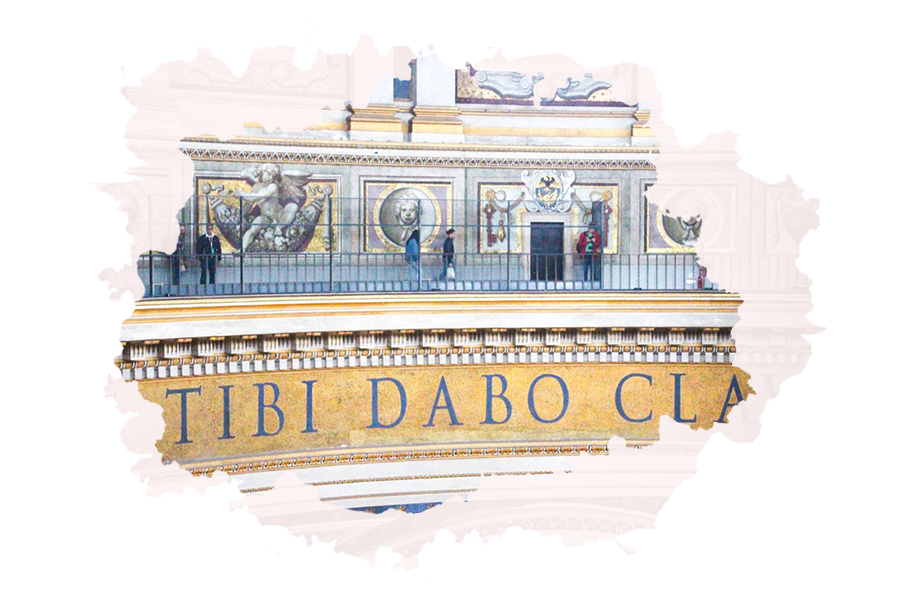 Auf einem Bild kannst du den Spruchband sehen, der sich am unteren Rand der Kuppel befindet. Dieses Band hat eine Höhe von 2 Metern – die Buchstaben sind in etwa 1,50 Meter hoch. Wenn man unten im Petersdom steht, meint man das gar nicht – aber hier sieht man die volle Größe!
