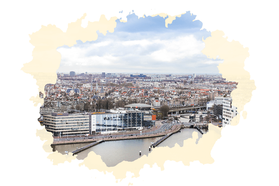 The observation tower is located outside the center, across the canal in North Amsterdam. The free ferries will get you there safely. And then you can enjoy the view of Amsterdam from there!