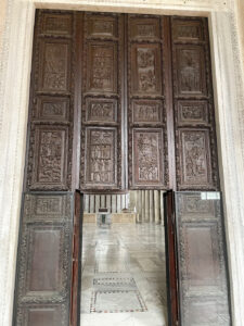 On the other side of the entrance (i.e. from the outside), you can still see the original 5th century wooden door with its 28 reliefs (18 are still preserved). Each relief reflects a very significant event for the church. The first relief on the top left is the oldest depiction in wood of Jesus on the cross. Although he is not hanging on a cross here, standing upright and with his eyes open, this is because at this time people refrained from depicting the crucifixion in a truthful and suffering manner.