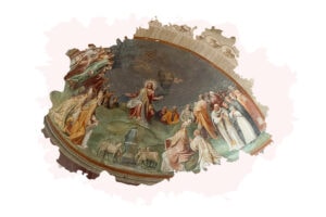 Above the main entrance is a mosaic with a golden inscription and two women symbolising the Judaism (left) and Paganism (right) of the church.